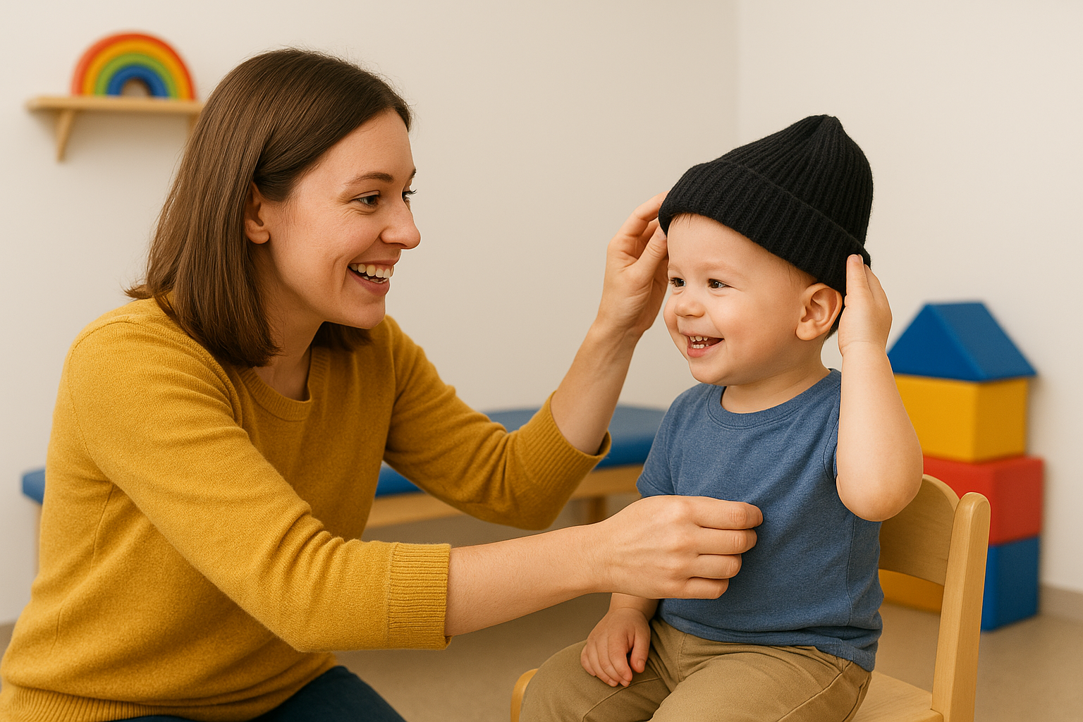 - Rồi khuyến khích trẻ: “Giờ đến lượt con đội mũ cho cô nào!”